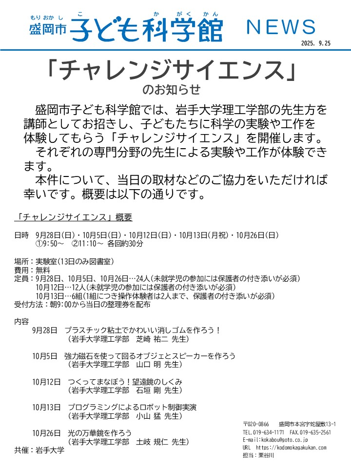 お知らせ・イベント トップ 施設案内 イベント プラネタリウム サイエンスショー ワークショップ 科学たいけんコーナー 星を見る会 団体のお客様へ 団体向け 各種申請書 学校教育利用 幼稚園・保育園の先生向け 小・中学校の先生向け 職場体験 インターンシップ ボランティア 博物館実習 アクセス 【報道機関の皆様へ】取材ご協力のお願い 2025/10/19 前のページにもどる