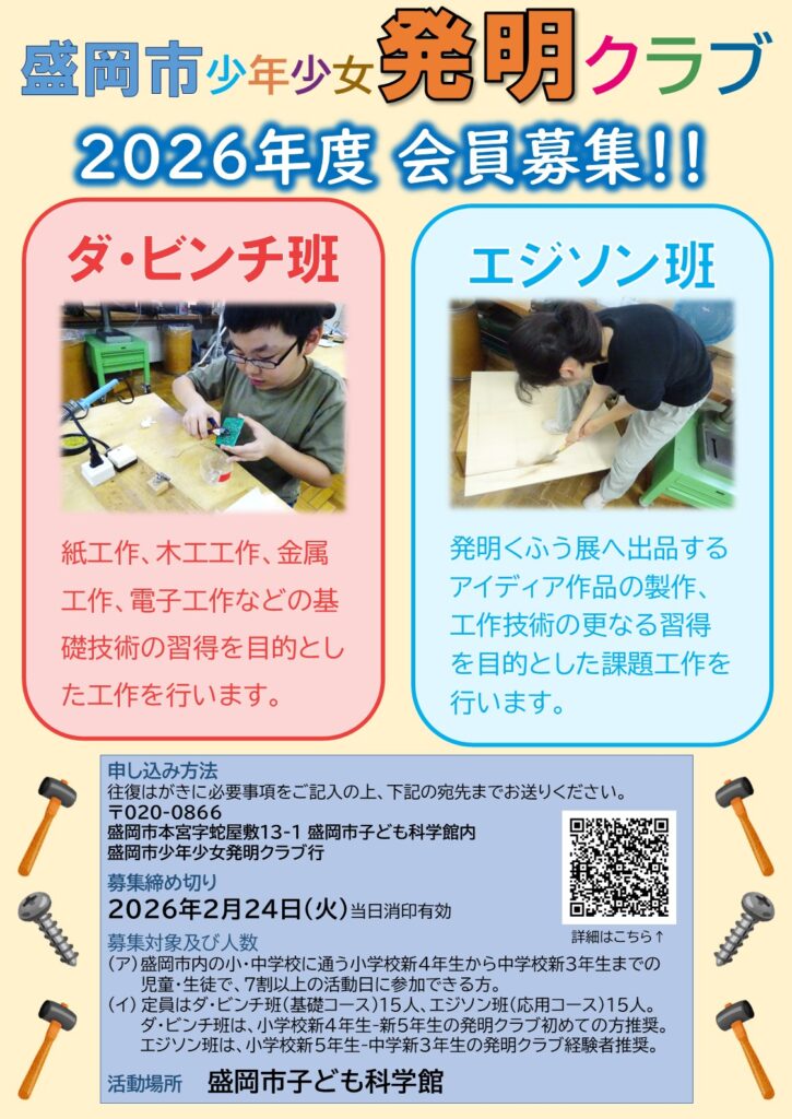 2026年度の盛岡市少年少女発明クラブの会員を募集しています。